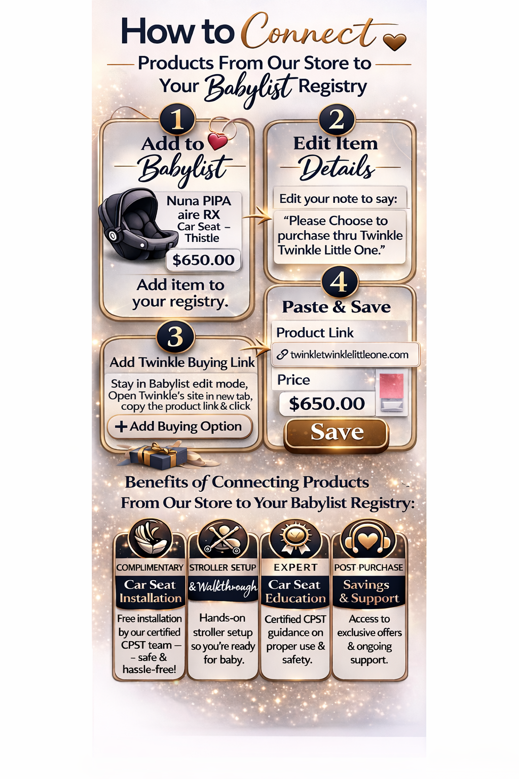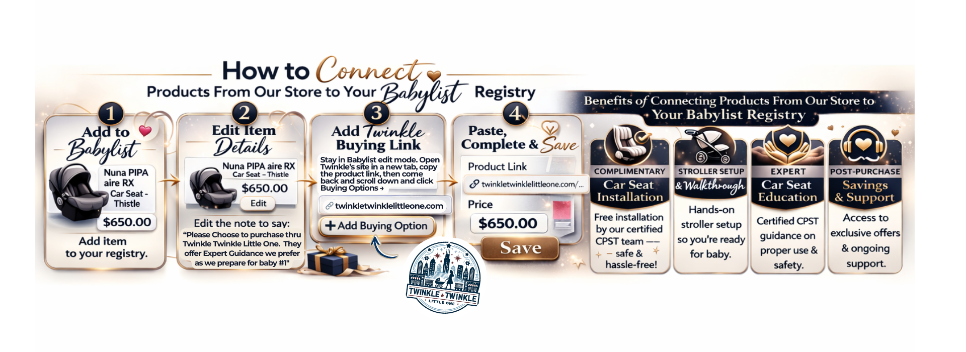 In-store car seat and stroller pickup with optional stroller set up (no car seat installation) at our Roscoe Village Location.
